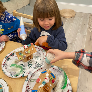 Our craft today was creating mini gingerbread house centerpieces for our local senior lunch program. This is our way of being considerate and caring towards members of our community. The girls had a great time decorating together!